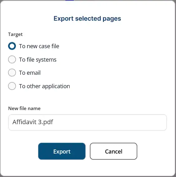 - To new case file – The selected pages will be added to the case as a new file with the new file name. This file will appear in the case’s file list.