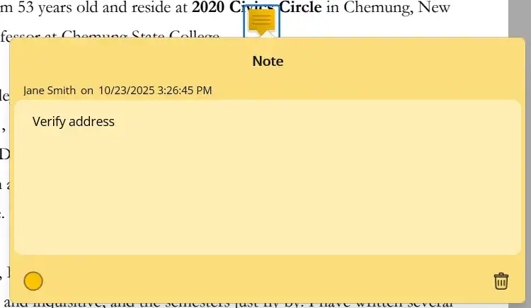 Click on the note icon to open the note. You can edit the text, change the note’s color (using the colored circle), or delete the note (click the trash can icon).