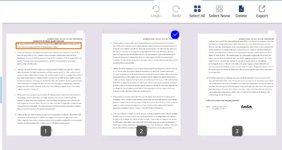 Delete pages from the file by selecting them and clicking Delete. All selected pages will be deleted from the file.