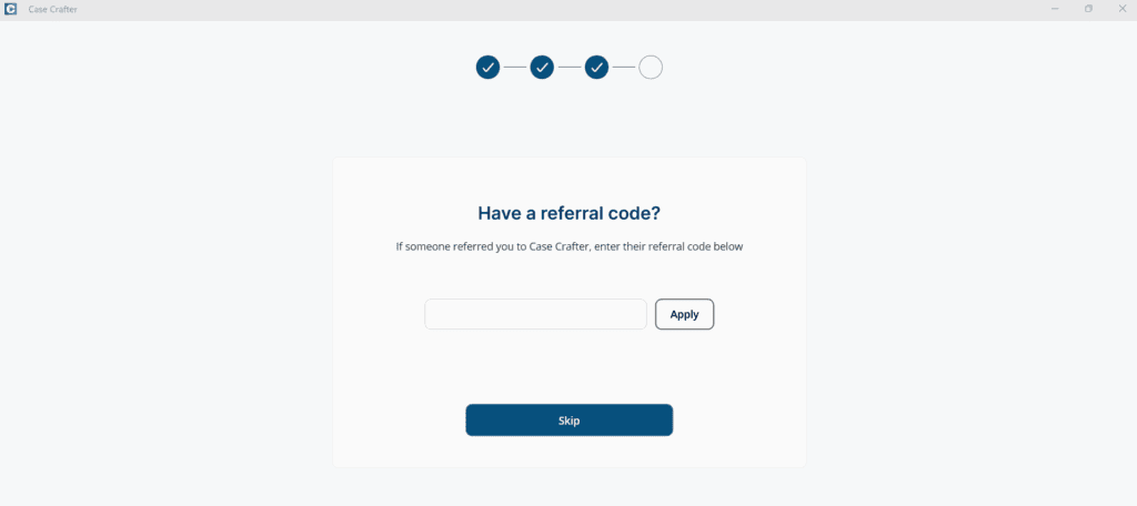 Enter a referral code if you have one, then click Apply, or click Skip.