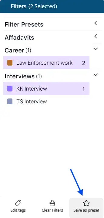 Select tags, then click Save as preset at the bottom of the Filters window.